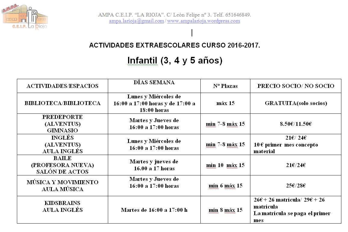 Las inscripciones podrán recogerse en el vestíbulo del Colegio, en la mesa de conserjería o descargarse en blog de la A.M.P.A. http://www.ampalarioja.wordpress.com, y se podrán entregar en el buzón de la A.M.P.A o por correo electrónico, enviándolas a la dirección ampa.larioja@gmail.com. En este último caso habrá que entregarlas durante la primera semana de octubre, debidamente firmadas en el despacho de la A.M.P.A, en horario de lunes a jueves de 16:00 a 18:00 horas.