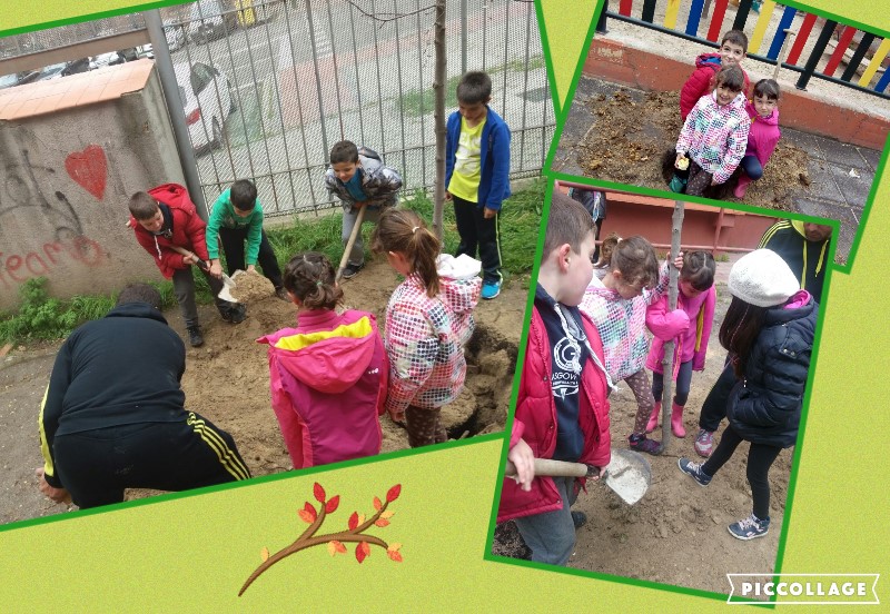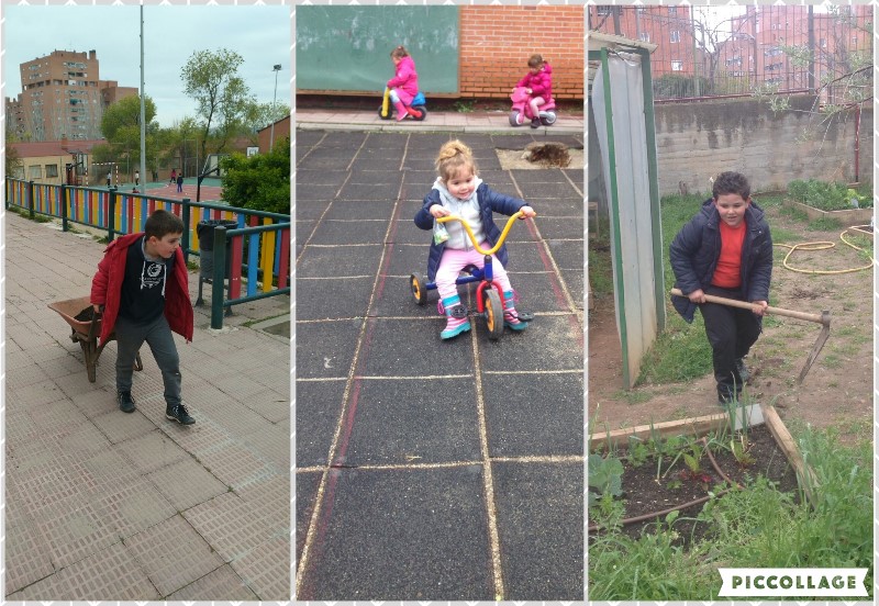 En seguida nos pusimos manos a la obra cogiendo azadas, palas, carretillas (que hubo que reconstruir), mantillo… hasta alguno se atrevió a manejar la máquina que nos dejaron para poder hacer los agujeros en la tierra, una especie de » tuneladora» sin la cual hubiera sido más que complicado el poder hacerlo… y allí todo el mundo arrimó el hombro… ¡hasta los más pequeños hacían turnos para coger las palas!