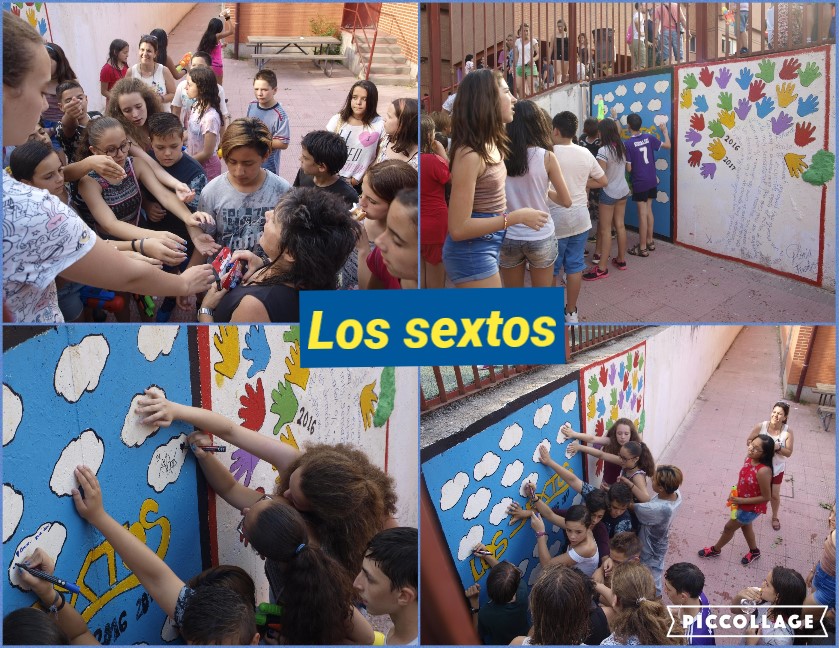 Tras la muestra, hicimos un pequeño homenaje a los alumnos de sexto de primaria que llegaban exhaustos del viaje de fin de curso junto con su profesora Chus. Pudieron poner un mensaje en un muro que pintamos previamente en el cole, con un poema de Gloria Fuertes… los rotuladores iban de mano en mano… todos querían plasmar el recuerdo de su paso por el colegio en el muro.