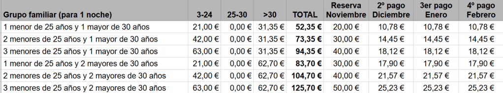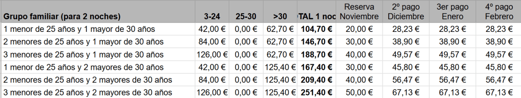 TARIFAS DE ALOJAMIENTO EN PENSIÓN COMPLETA por persona y noche, con el descuento por tener carnet de alberguistas grupal ya aplicado: