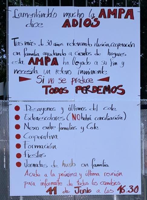 Las familias que estaban tirando de la AMPA van dejando el cole cuando sus peques pasan al instituto y van dejando paso a nuevas familias, pero últimamente, el número de familias que salen es mayor que el número de familias que entran para colaborar, por lo que las familias que estamos colaborando más activamente en la AMPA estamos sobrecargados de trabajo y percibimos poco interés/ayuda por parte del resto de familias socias (casos típicos: gente que se apunta a cosas y luego no se presenta sin avisar previamente, recoger después de las fiestas, etc.). Si a esto le unimos cambios en la situación personal/laboral de las familias que forman la junta directiva, nos encontrábamos con el caldo de cultivo perfecto para disolver la asociación y fue por ello que hicimos el llamamiento público.