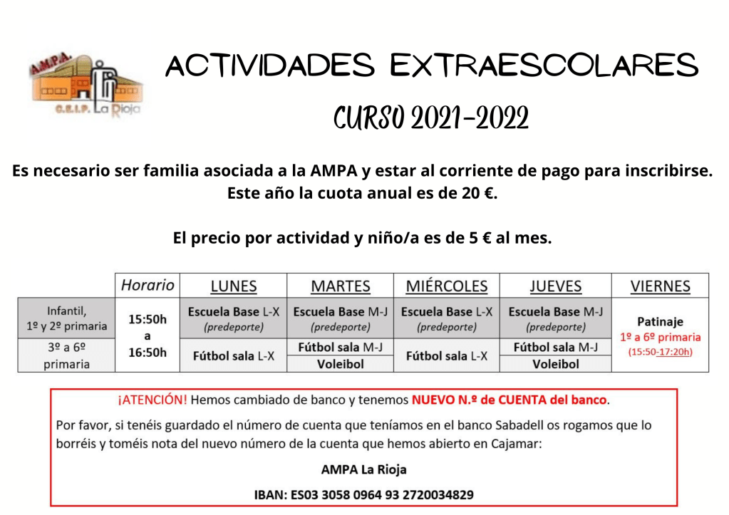 - ¿Se pueden apuntar a estas extraescolares peques de otros coles? Se pueden apuntar si quedan plazas libres, porque tienen preferencia los alumnos de La Rioja y han de estar asociados a una AMPA (a la de su cole o a la nuestro).