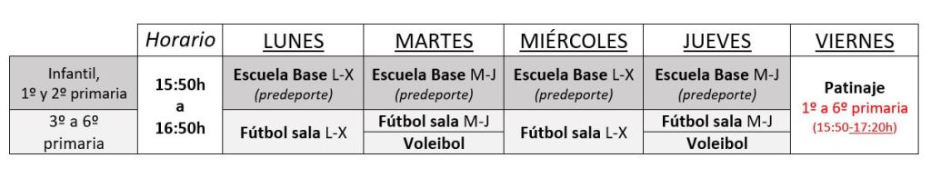 En el siguiente cuadro, tenéis toda la información sobre actividades, precios, horarios y cursos a los que van dirigidas las extraescolares.