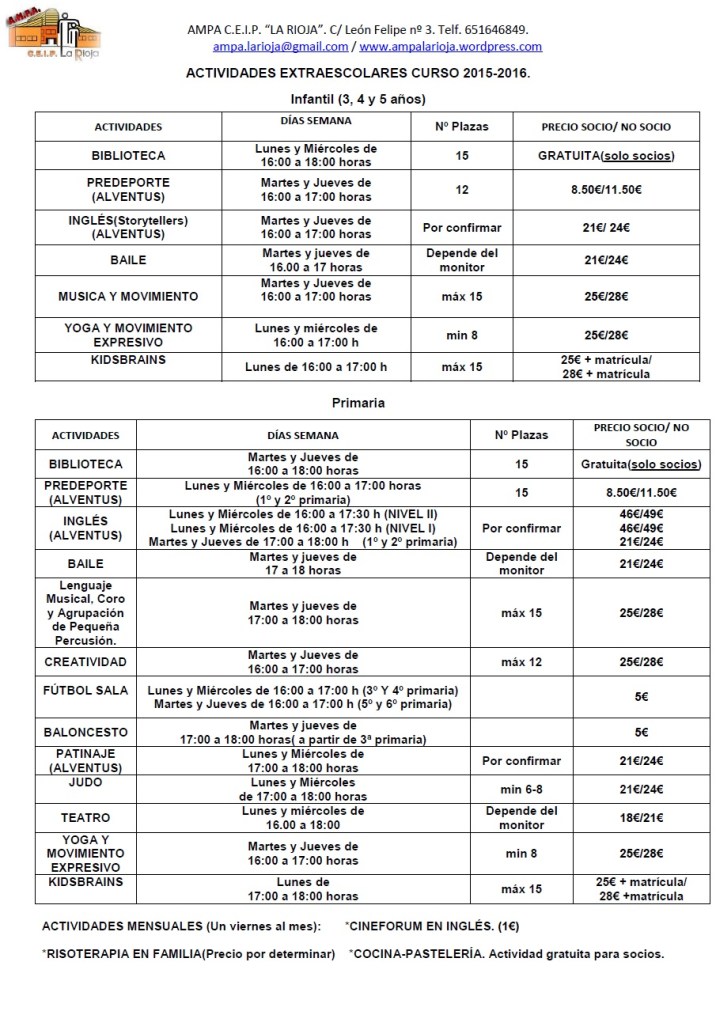 Podréis consultar todas las actividades extraescolares que se ofrecen este curso y el horario en el que se impartirán en el tablón del colegio y en el blog de la A.M.P.A.