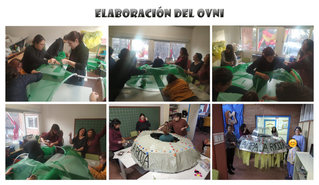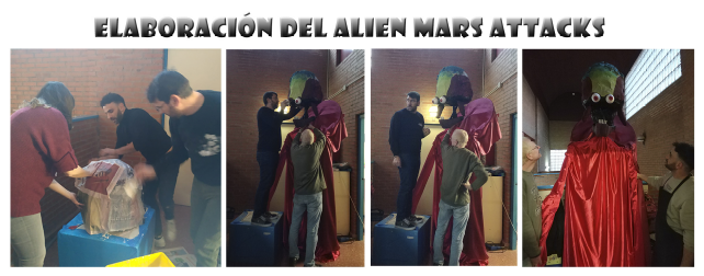 Se acordó elaborar un ovni y el alien de Mars Attacks en el tiempo record de dos semanas. Diferentes familias acudieron a las jornadas que se convocaron para ayudar a construirlos, dando también la oportunidad de realizar los disfraces en el colegio. Este tipo de encuentros favorecen a que las familias se sientan parte del colegio y contribuyen a que nuestr@s hijas e hijos establezcan relaciones con compañeros y compañeras de otras edades. Fueron jornadas entretenidas donde se pusieron a prueba las habilidades y la creatividad de las familias.