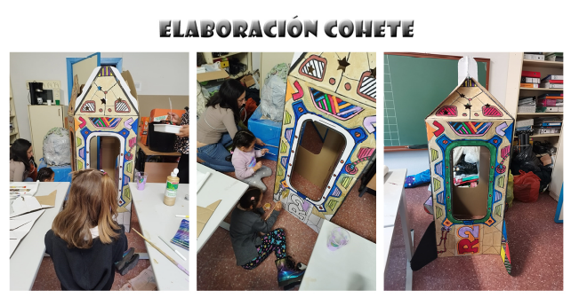 Además, Nines, una mamá del cole, nos trajo un cohete de cartón que pintamos entre todos, nin@s y adult@s, con toda clase de materiales que se aportaron.