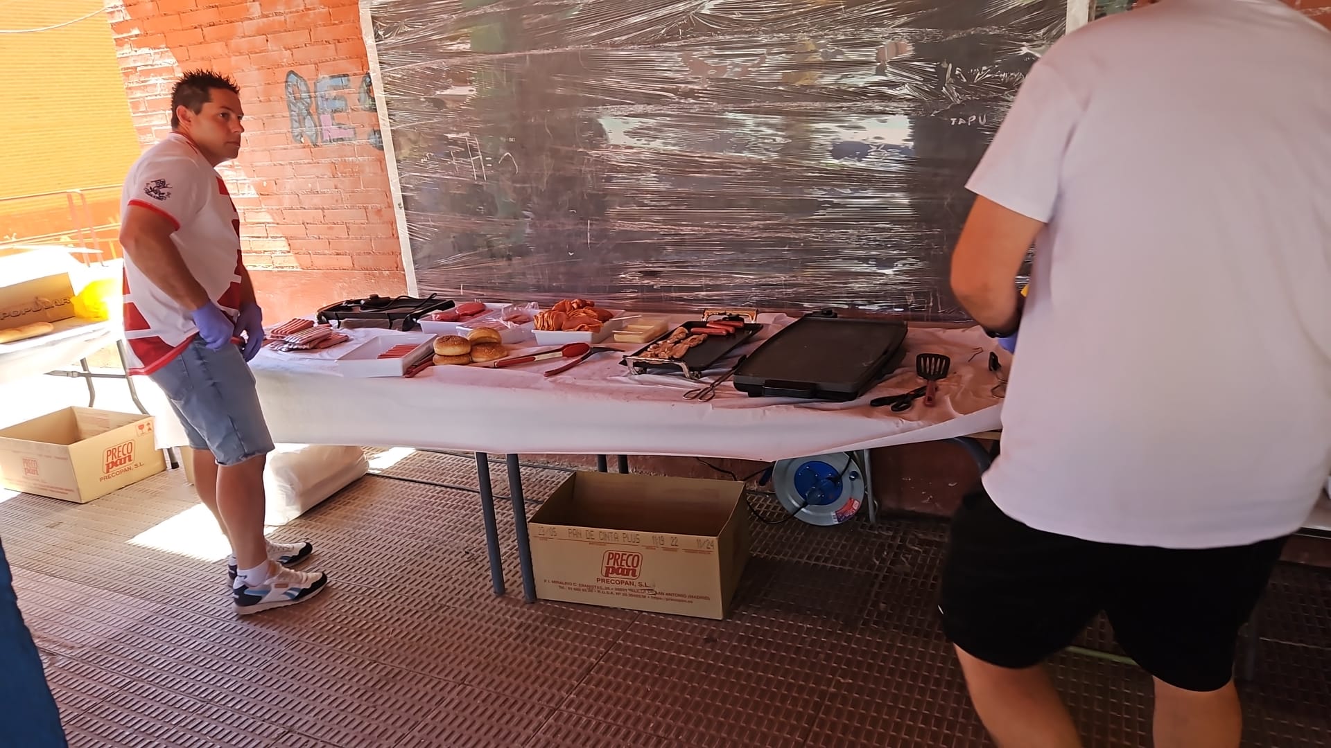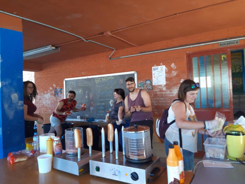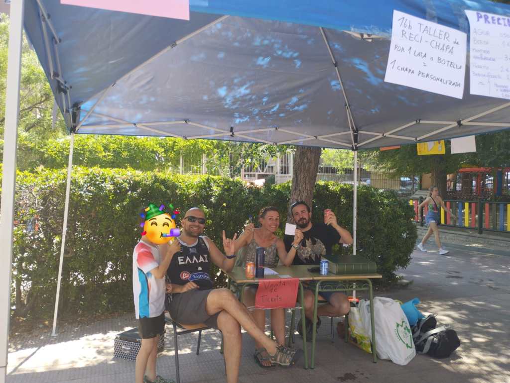 La fiesta comenzó por la mañana y se desarrolló durante todo el día. No faltó de nada para diversión de pequeños y mayores: castillos hinchables con agua, taller de chapas a cambio de reciclar las botellas de agua y latas, música, bar con todo tipo de manjares: perritos, hamburguesas, bocadillos de chorizo y panceta…y muchos refrescos para hidratarse en un día de mucho calor. Como anécdota, para que os hagáis una idea del éxito del bar, hubo que hacer una segunda compra de carne y bebida ¡para abastecer la demanda de los comensales!