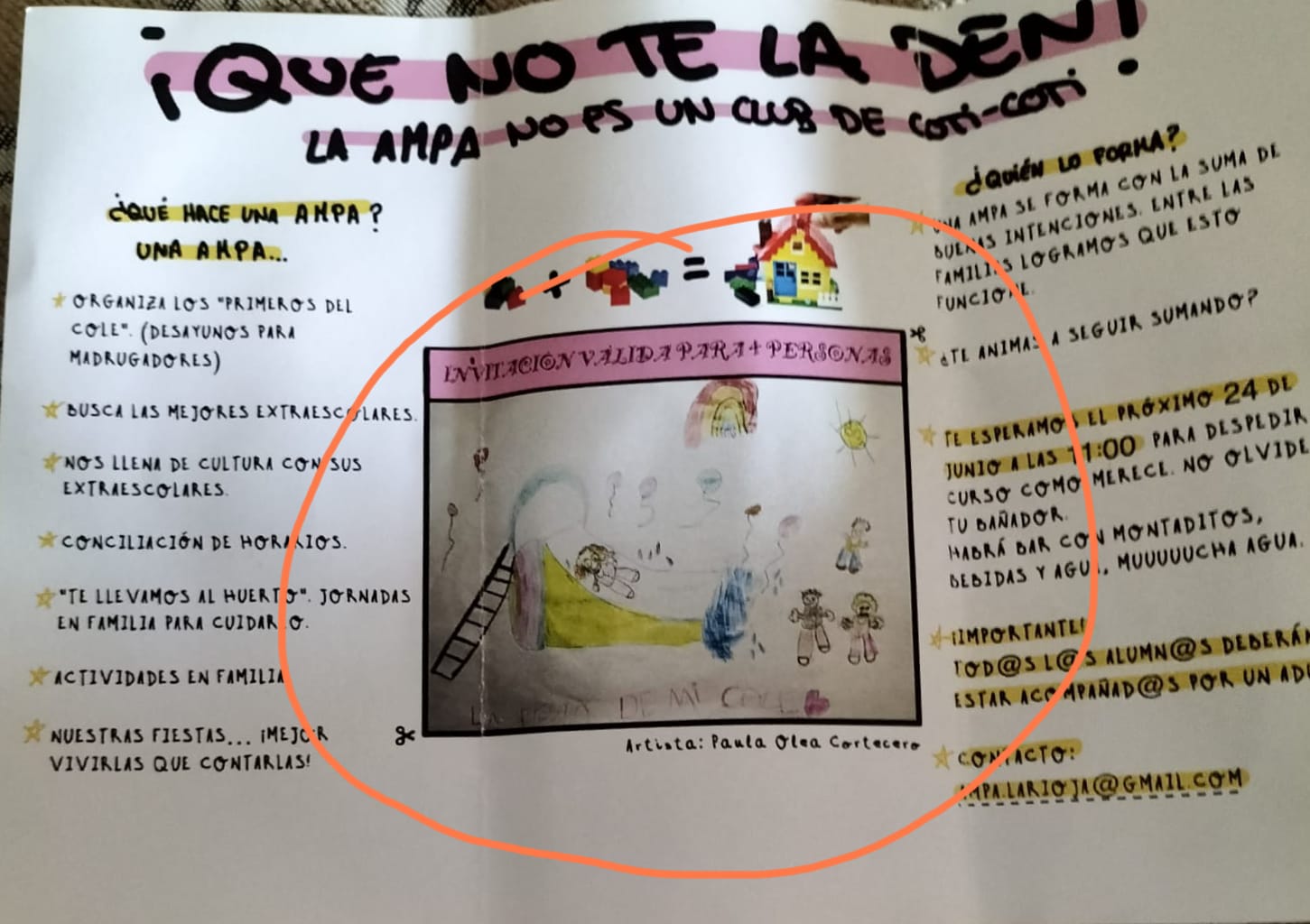A cada peque le han dado una invitación para que pueda venir la familia y acompañantes y podamos controlar así el aforo. La invitación está en un tríptico que describe lo que hace la AMPA.