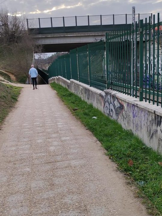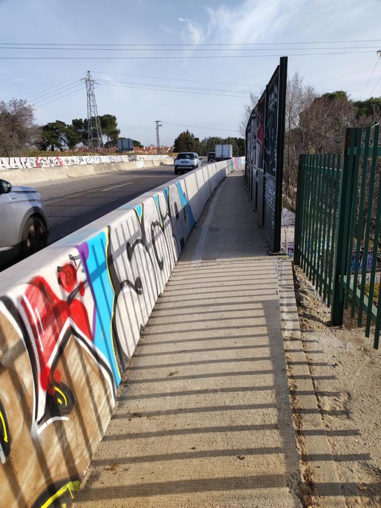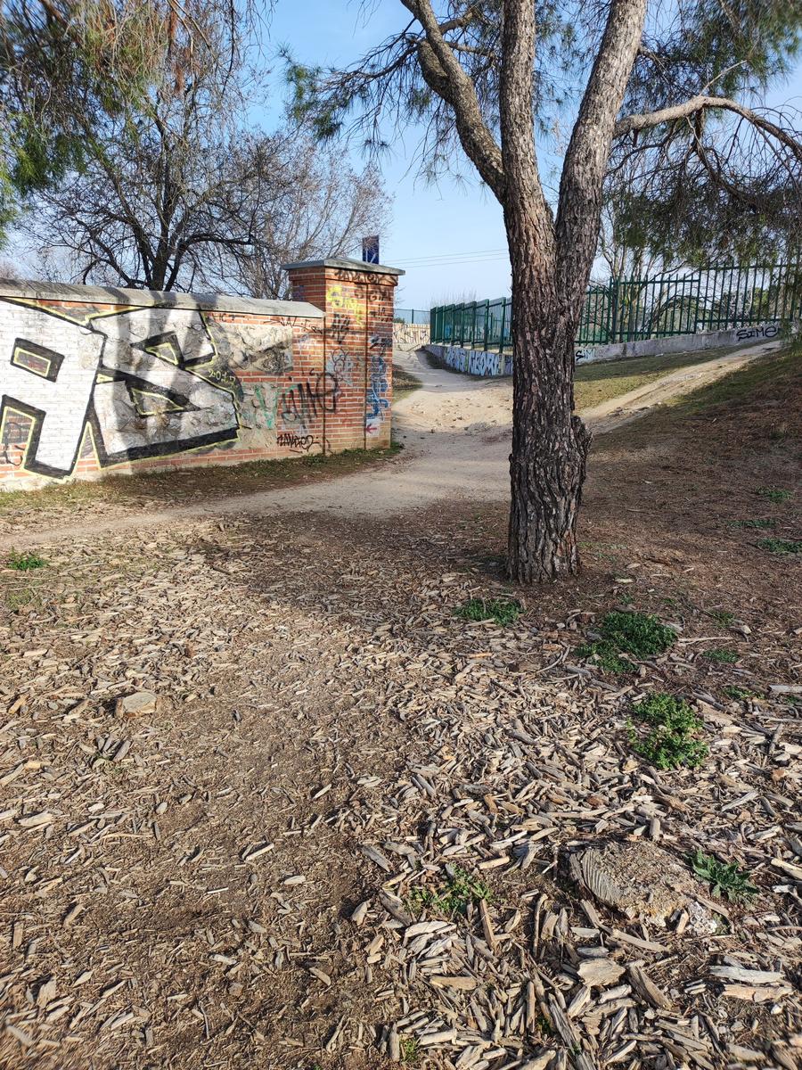 Llegamos al otro puente peatonal que cruza las vías y nos encontramos varios caminos que se cruzaban allí, además vimos que había muchas bicis, por lo que entre los 3 caminos que podíamos coger la continuar la ruta, elegimos por el que menos bicis iban. Cogimos uno que iba en diagonal y les dijimos a los/las peques que siguieran el camino hasta que encontraran el muro que bordea la Casa de Campo.
