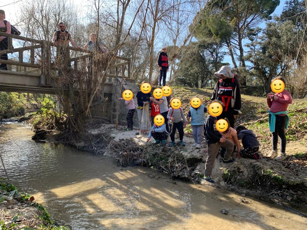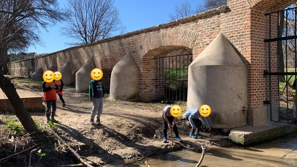 Fuimos subiendo hacia una zona elevada cercana a la carretera y al encontrar el muro, les propusimos el siguiente reto: «Hay que encontrar un arroyo y ver como atraviesa el muro». Tuvieron claro que el arroyo estaría bajando el camino, así que salieron corriendo y pararon al llegar a un arroyo que estaba seco, pero ahí ya vieron que atravesaba el muro por unas puertas metálicas. Puertas que también aprovecharon para pasar de un lado al otro. Por cierto, al otro lado está el Parque Forestal Adolfo Suárez y si alguno va por allí, que nos cuente la experiencia 😉.