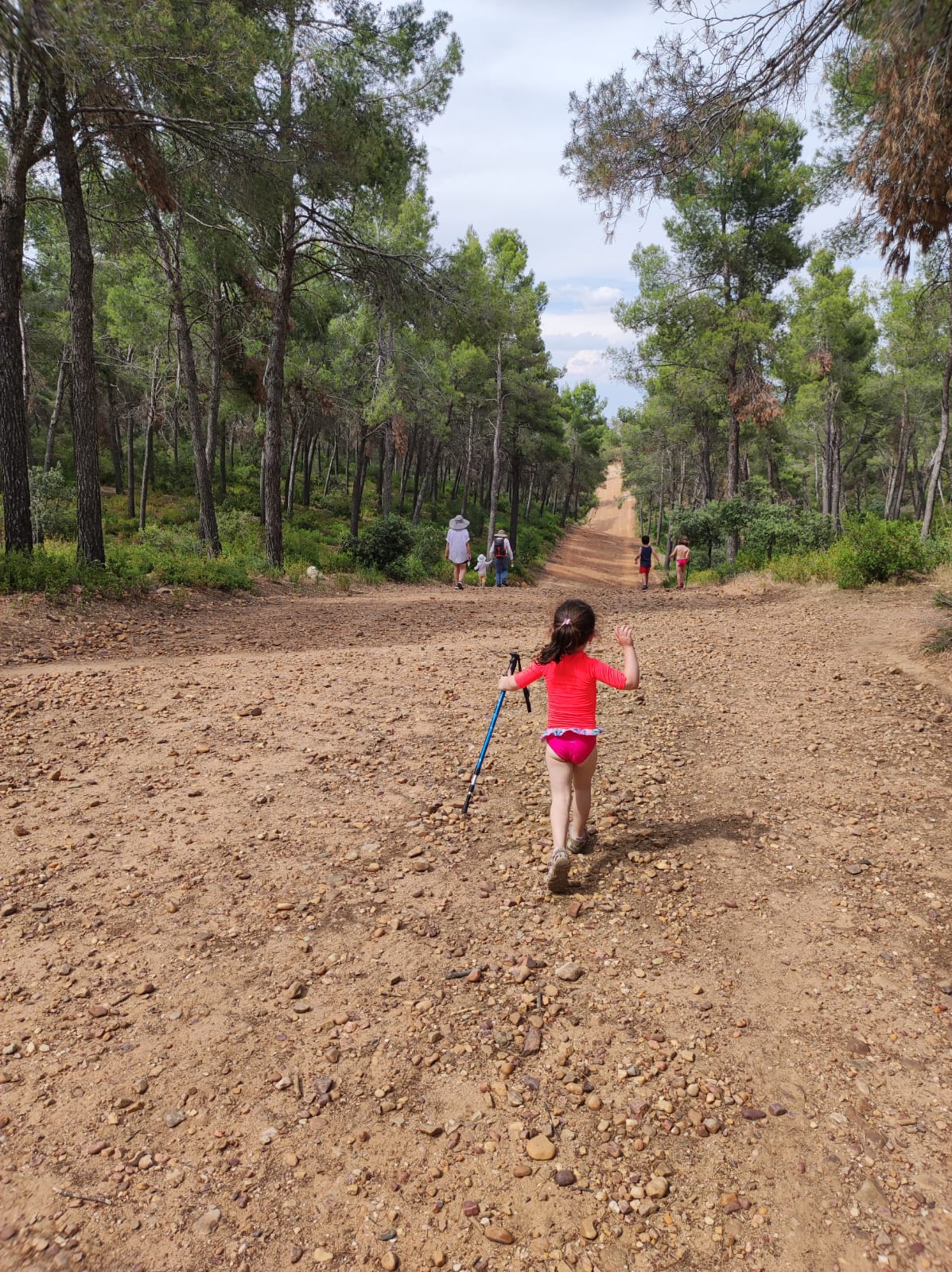 La ruta empezó con unas parcelas con viñas y olivos que pasamos rápido, porque ya empezaba a pegar el sol, hasta llegar al pinar, que se estaba mas fresquito, el guía empezó rápido, jejej, después se cansaba y había que cogerlo en brazos un rato. El primer tramo de pinar se hizo muy corto porque era casi todo bajada y la sombra y la brisa que corría, se agradecía.