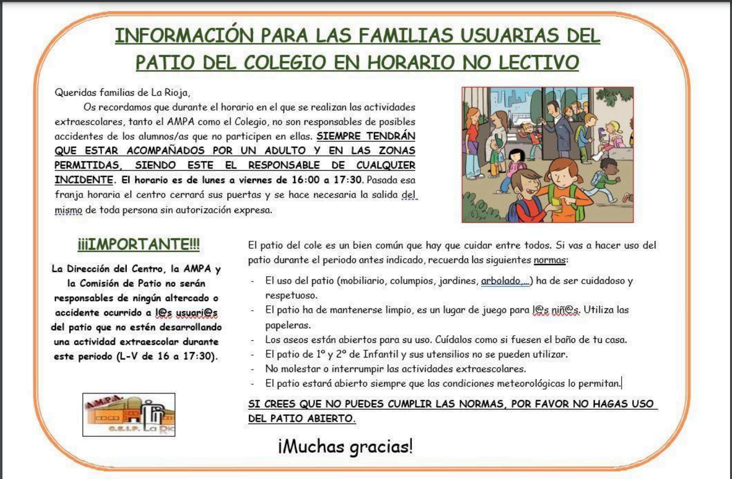 ● Quiénes pueden estar en el cole: Todas las familias que pertenezcan al cole, niños, madres,